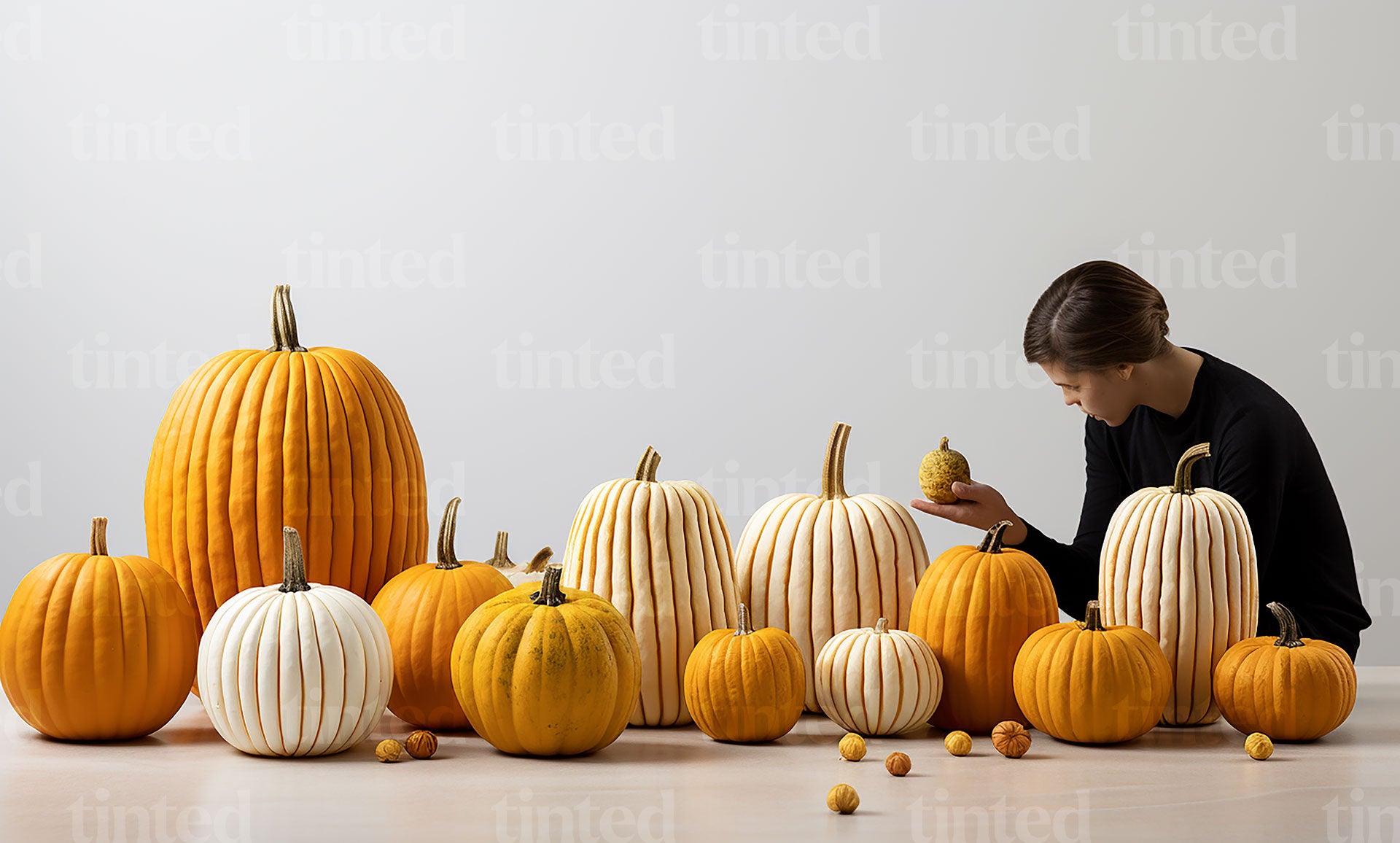 Woman assembling pumpkins decorations laying on the floor.