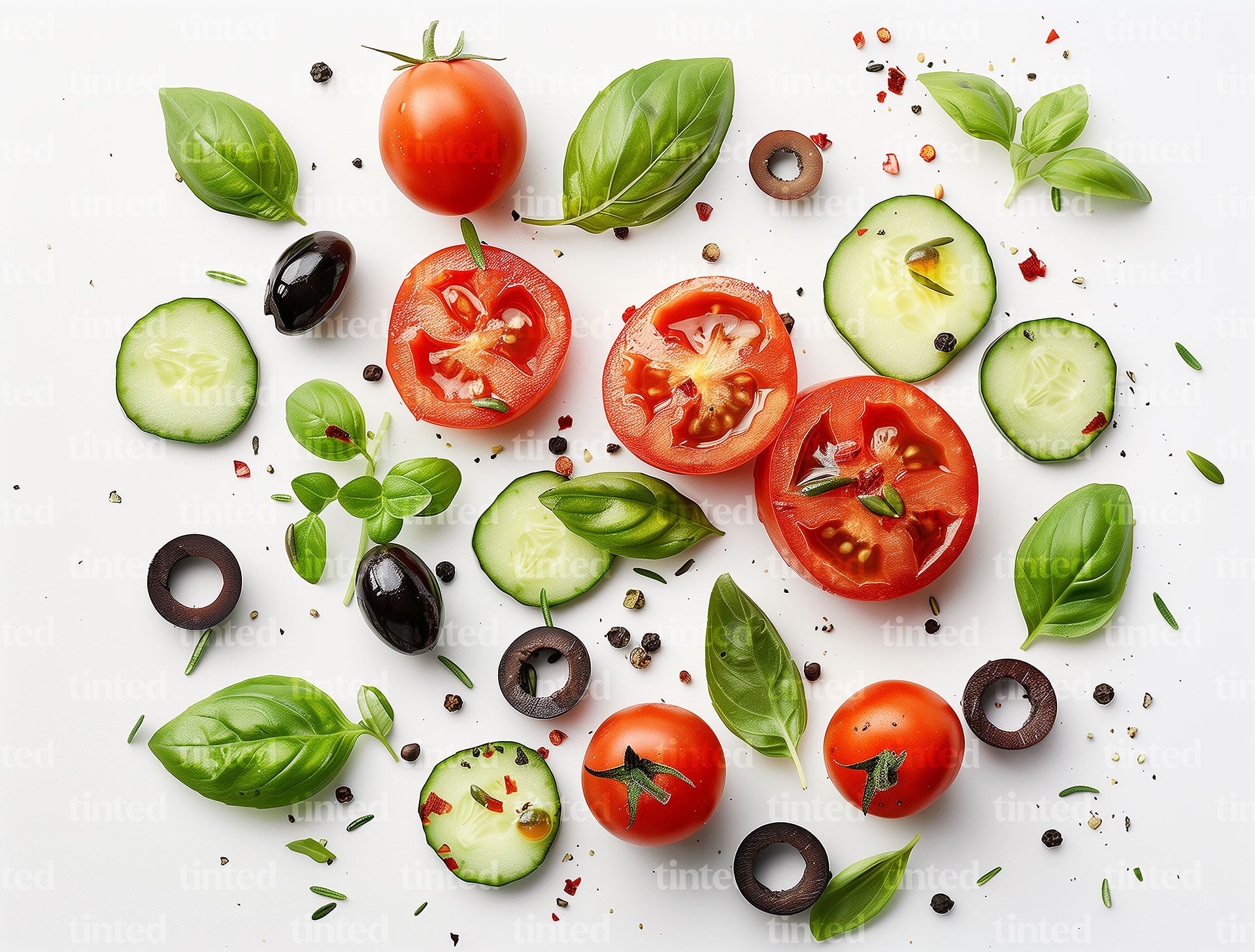 IMAGE# Fresh Mediterranean Salad Ingredients Flat Lay – Tomatoes, Cucumbers, Basil and Olives on White Background